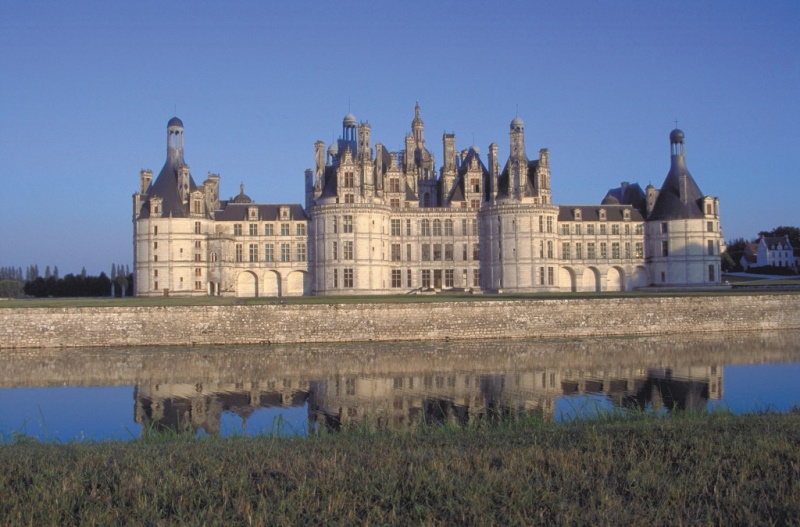 ソローニュの森の中に建ち、城を取り巻く堀の長さがフランス最長の31kmという壮大なスケールを持つシャンボール城。敷地だけではなく城自体も幅156m,奥行117m、部屋数440室という規模で、ヴェルサイユ宮殿を彷彿させます。この城はイタリアの芸術に魅せられたフランソワ一世が以前から狩猟館を自分好みの増改築させたもので。レオナルド・ダ・ヴィンチが設計の素案を作ったといわれています。1519年に着工された工事はアンリ二世の時代を経て、ルイ十四世時代の1685年に完成しました。見どころはフランス・ルネッサンス様式の装飾が施された城館内中央にある二重螺旋階段。この会談は屋上テラスに通じており、人がすれ違わずに昇降できる仕組みになっているます。そしてこのテラスからは見事な彫刻がなされた長塔や煙突、会談などが立ち並ぶ光景を目にできます。また城館の歴史がわかる絵が展示されている小館もこのテラス上にあります。フランソワ一世は北の塔仁王の居室を、「太陽王」といわれたルイ十四世は白の中心に近いところに部屋を設えさせました。